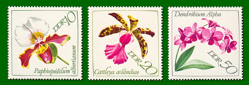 Drei tropische Orchideen aus dem Markensatz der DDR vom 19. November 1968: