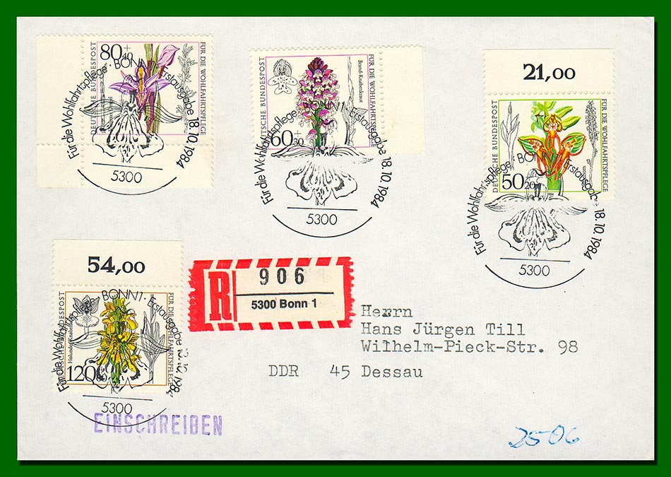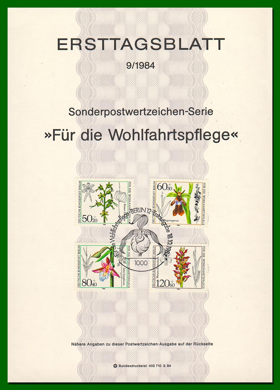 Das Berliner Ersttagsblatt mit der Markenausgabe "Für die Wohlfahrtspflege" vom 18.10.1984 mit vier heimischen Orchideen: Kleines Zweiblatt (Listera cordata), Fliegen-Ragwurz (Ophrys insectifera), Sumpf-Stendelwurz (Epipactis palustris), Wanzen-Knabenkraut (Orchis coriophora).