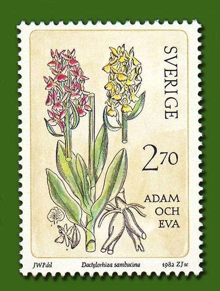 Die sehr gefährdete Holunder-Fingerwurz (Dactylorhiza sambucina) sieht man auf einer schwedischen Briefmarke vom 9. Oktober 1982.