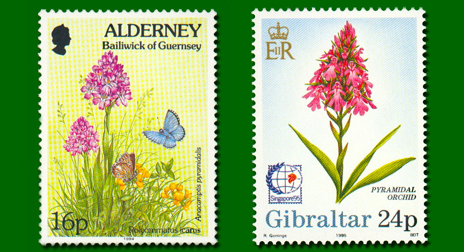 Briefmarken der Kanalinsel Alderney und Gibraltars zeigen die Pyramidenorchis (Anacamptis pyramidalis).