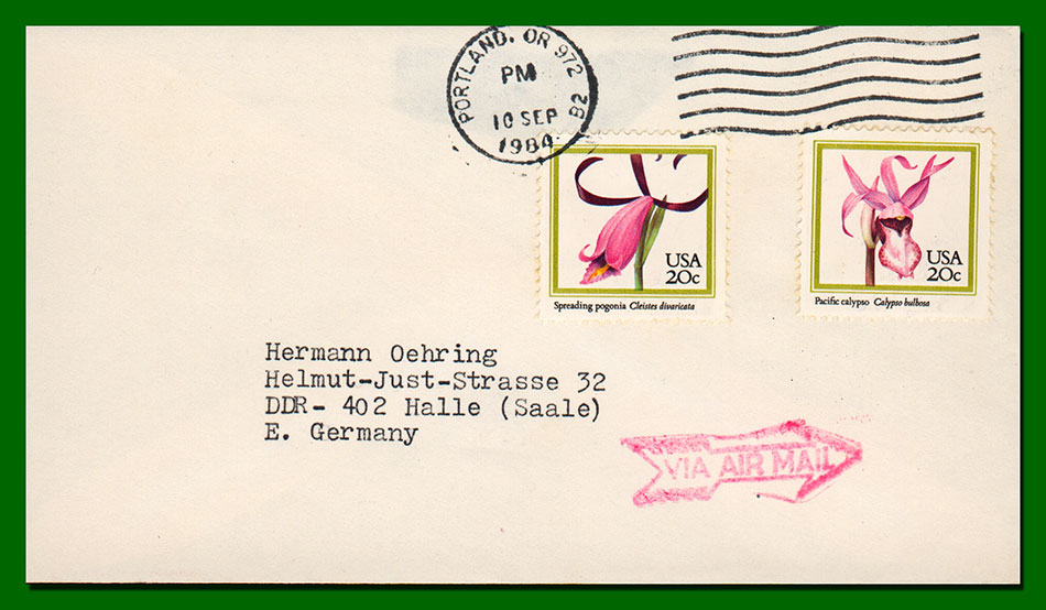 Der Luftpostbrief aus den USA ist mit zwei Marken frankiert, auf denen Orchideen abgebildet sind (Calypso bulbosa (Norne) und Cleistes divarticata). Die Norne kommt auch in Nordeuropa vor.