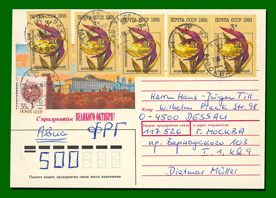 Bedarfsbrief aus der Sowjetunion mit fünf Frauenschuh-Briefmarken (Cypripedium calceolus) vom 7. Mai 1991.