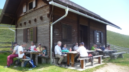 Aufbruch zur Exkursion auf die Hochalmen. | Rast auf der Hochalm weit über der Baumgrenze. |